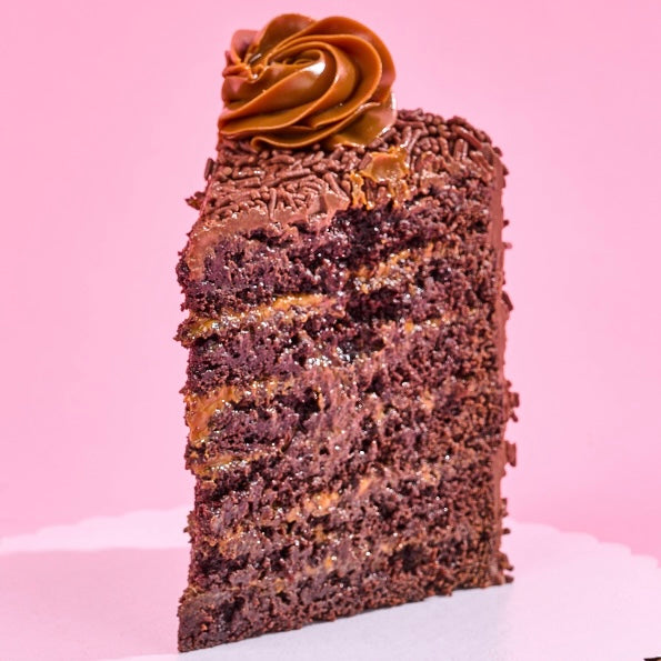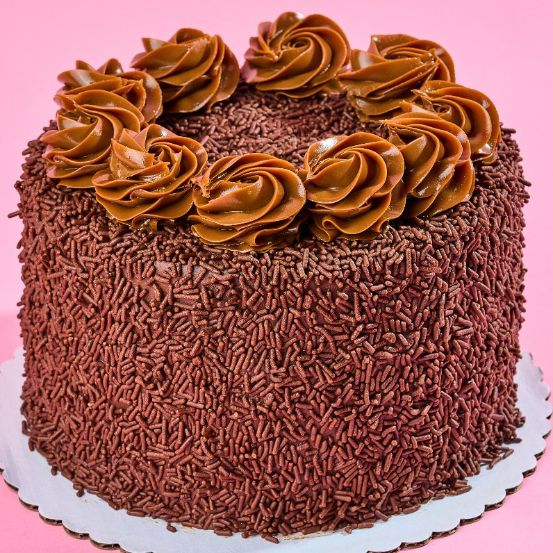 MOIST CHOCOLATE CAKE IN THIN LAYERS FILLED WITH DULCE DE LECHE AND COVERED WITH CHOCOLATE AND CHOCOLATE SPRINKLES